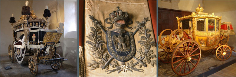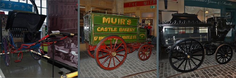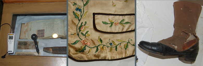 Photos: Detection of unsafe light levels for a museum case, mold on embroidered vest, and insect damage to a 19th c. shoe (various museums); Condition survey of vehicles, Versailles Palace: Funeral coach of Louis XVIII (1824), Baptismal coach of the Duke of Bordeaux, with detail (1821); Condition Survey of Wooden Vehicles, Museum of Transport, Glasgow: Gig (19th C.), Muir's Baker's van from Rothesay (c. 1910), Hearse (c. 1890); Condition surveys of Robert Burns Birthplace Museum bedroom furnishings, with the bed in which the poet was born (in 1758).