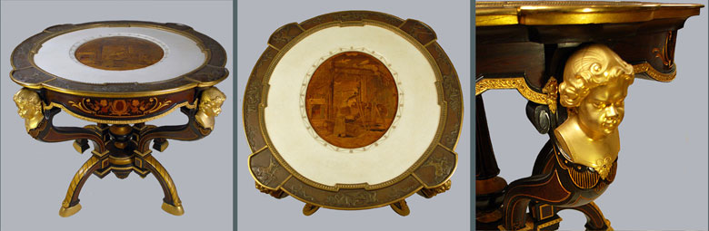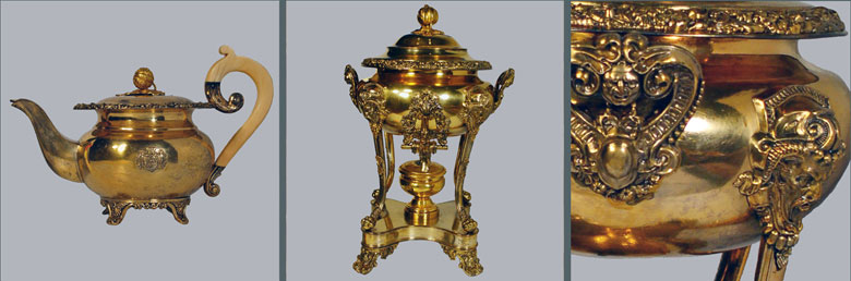 Photos: PT Barnum's Vermeil Samovar and Tea Pot (Barnum Museum); Table by Julius Dessoir for PT Barnum's Iranistan mansion (1848, Barnum Museum); Connecticut Clock (c. 1820, private collection); Table by Potier & Stymus for Nathaniel Wheeler's Bridgeport Mansion (c. 1867, Barnum Museum).