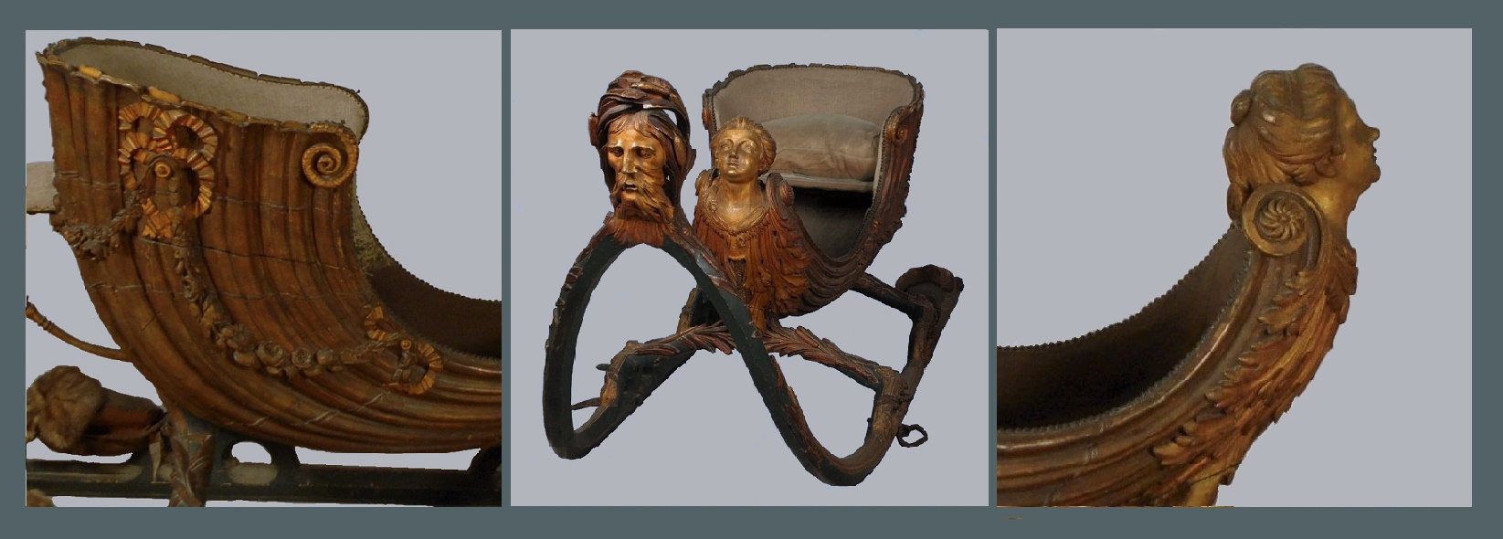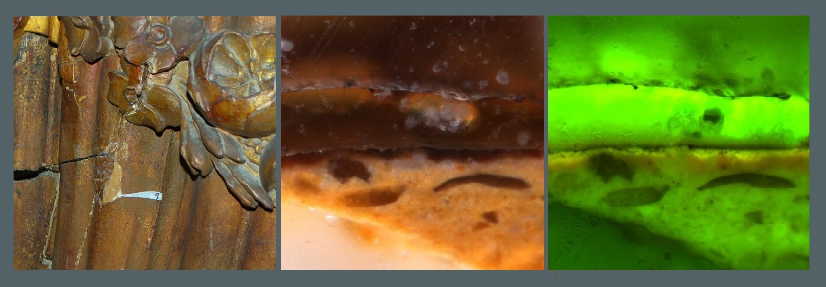 Material AnalysisCase Study : "The Siren" (c. 1740), in the Coach Gallery, Palace of VersaillesIt is often useful to understand what materials the artist used (e.g. pigments and paint media), for the safety of the artwork during conservation treatment. This is especially the case when treating complex layers of paint, lacquer or gilding. In many cases, analysis can also differentiate between original paints and later-applied restoration. In the case of the sleigh called "The Siren," we assisted in the analysis of individual finish layers, to help determine which were original and to better protect them during conservation treatment. Whereas the figure of the siren at the prow was decorated with gold leaf, the sides of the sleigh were covered with silver leaf having transparent, colored glazes of red, green and yellow over the silver. The overall effect of the sides was that of a semiprecious stone having colored veins. The vehicle had been revarnished during maintenance, most likely in both the 18th and 19th centuries, and the later-appplied varnish had substantially darkened with age. Its safe removal (without affecting layers underneath) was a challenge. Samples of the finishes, as tiny as a pinhead, were examined under the microscope with visible light, and under different types of UV light yielding fluorescence. In the slideshow above, a sample from the side of the sleigh (taken adjacent to an area of loss from flaking) is examined under the fluorescence microscope at 50x magnification. UV illumination reveals a series of layes that are undetectable under visible light. Chemical Analysis of micro-samplesFourier Transform Infrared (FTIR) micro-spectrometry provides general information on the composition of certain paints, and usually can characterize certain paint media (as oil, resin, or protein for example). To identify the elements composing metal leaf and obtain further information about inorganic pigments, which may go undetected by the FTIR analysis, either Scanning Electron Microscopy with Energy Dispersive X-ray Spectroscopy (SEM-EDS) analysis, or Scanning Electron Microscopy-Wavelength Dispersive X-ray analysis (SEM-WDX), can be done. To identify organic dyes of glaze pigments and textiles, High Performance Liquid Chromatography (HPLC) can be used. We can help clients determine which analyses may be necessary to understand their work of art, whether it be for its conservation-restoration, long-term preservation, or simply to identify the historical techniques employed by an artist. We coordinate such analyses, conducted in the laboratories of our associates in either the USA or Europe, and provide our clients with reader-friendly summaries that explain the findings and their impact upon the conservation of their work of art. |